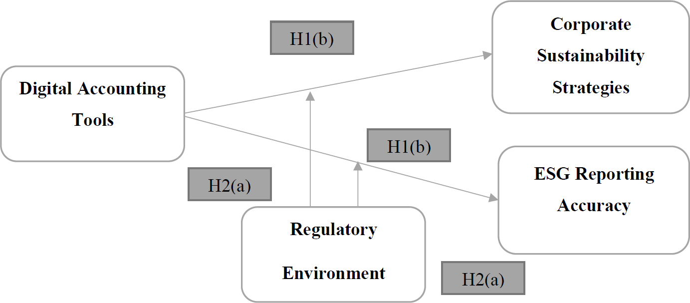 Standardised Regulatory guidelines and vigorously applied strategies encourage organisations to embrace digital tools since they believe it is necessitated by the need to comply with reporting requirements and guarantee compliance (Taha & Alshurafat, 2025; Zheng & Bu, 2024). Furthermore, the correspondence to the sustainability goals and ESG standards also promotes the implementation of such tools, as organisations are interested in receiving technology that would facilitate not only compliance with the regulations but also their sustainability goals in general (Williams, 2024). Hence, the regulatory clarity and enforcement are the most important determinants of the effectiveness of digital accounting tools in ESG reporting (Carignan & Marvellous, 2025; Yeoh, 2021). The available literature reviews the influence of the regulatory context and the moderating association amid digital accounting tools and sustainability strategies of corporates. Hence, it is hypothesised that;